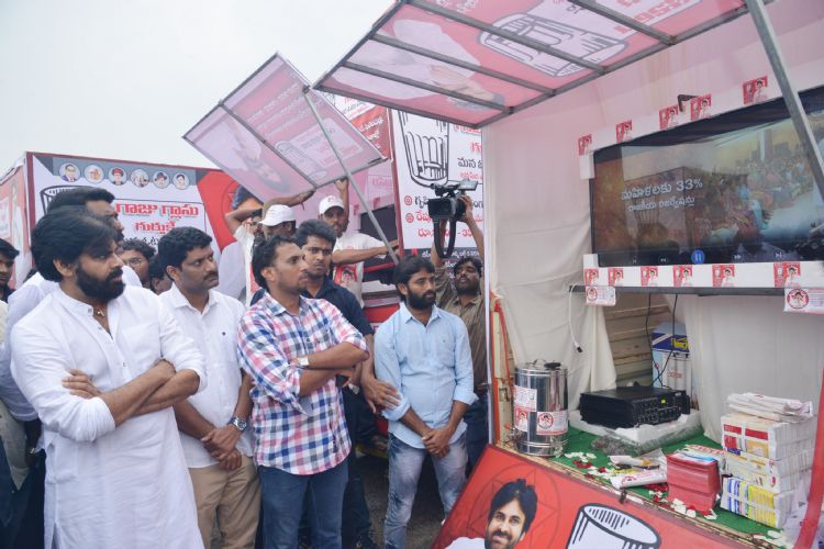 Janasena party chief Pawan Kalyan launched 17 campaign vehicles on Monday. These vehicles will travel to villages and campaign for the party. Arrangements were made to give Tea to the people to popularize the party symbol Tea glass.