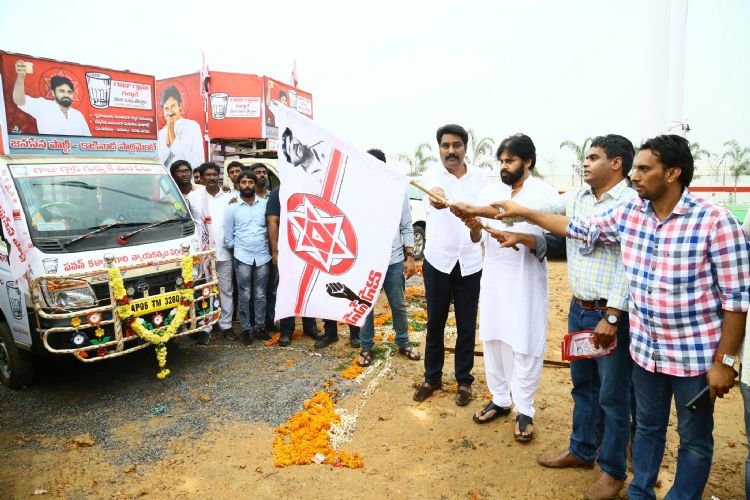 Janasena party chief Pawan Kalyan launched 17 campaign vehicles on Monday. These vehicles will travel to villages and campaign for the party. Arrangements were made to give Tea to the people to popularize the party symbol Tea glass.