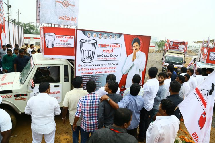 Janasena party chief Pawan Kalyan launched 17 campaign vehicles on Monday. These vehicles will travel to villages and campaign for the party. Arrangements were made to give Tea to the people to popularize the party symbol Tea glass.