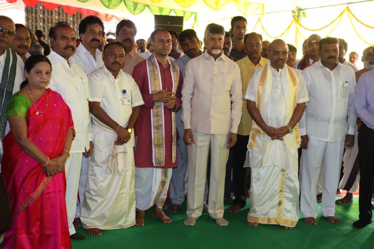 The construction of Sri Venkateswara Divyakshetram at Venkatapalem in Tullur mandal of Guntur district commenced on a religious note with Bhookarshanam and Beejaavapanam events on Thursday. CM Chandrababu Naidu took the plough and dug the area amidst chanting of Veda mantras.
