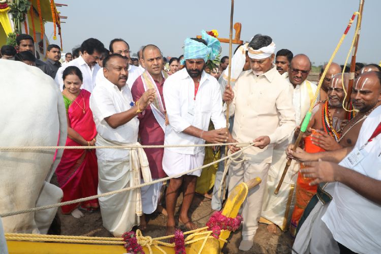 The construction of Sri Venkateswara Divyakshetram at Venkatapalem in Tullur mandal of Guntur district commenced on a religious note with Bhookarshanam and Beejaavapanam events on Thursday. CM Chandrababu Naidu took the plough and dug the area amidst chanting of Veda mantras.