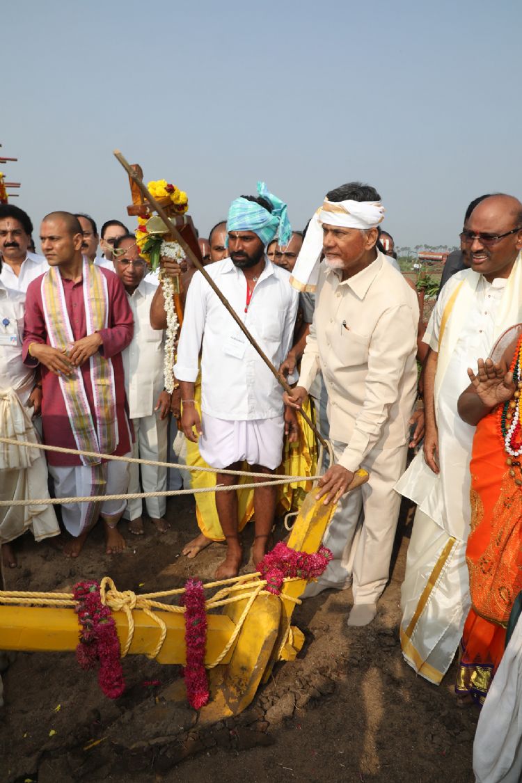 The construction of Sri Venkateswara Divyakshetram at Venkatapalem in Tullur mandal of Guntur district commenced on a religious note with Bhookarshanam and Beejaavapanam events on Thursday. CM Chandrababu Naidu took the plough and dug the area amidst chanting of Veda mantras.