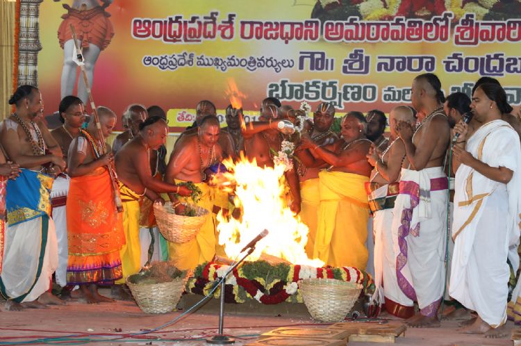 The construction of Sri Venkateswara Divyakshetram at Venkatapalem in Tullur mandal of Guntur district commenced on a religious note with Bhookarshanam and Beejaavapanam events on Thursday. CM Chandrababu Naidu took the plough and dug the area amidst chanting of Veda mantras.
