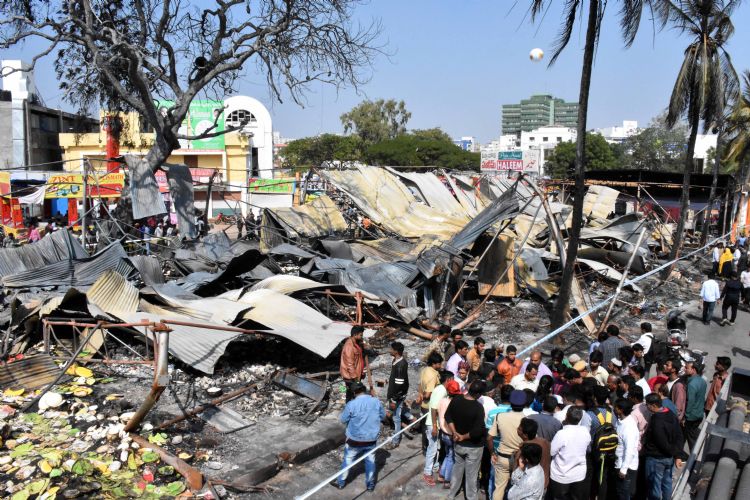 Stall owners look at the debris of their stock which was reduced to ashes in a major fire that broke out in Exhibition at Nampally on Wednesday night. There were some heated and angry moments at Exhibition Society office where stall owners held protest demanding compensation - INN Photos