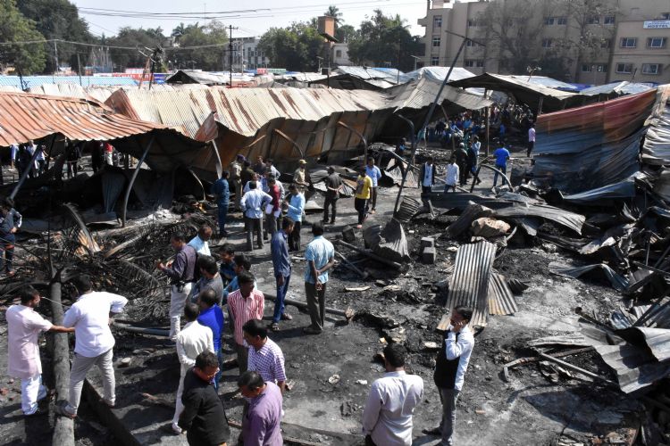Stall owners look at the debris of their stock which was reduced to ashes in a major fire that broke out in Exhibition at Nampally on Wednesday night. There were some heated and angry moments at Exhibition Society office where stall owners held protest demanding compensation - INN Photos