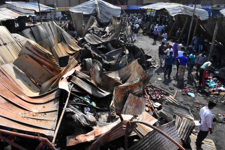 Stall owners look at the debris of their stock which was reduced to ashes in a major fire that broke out in Exhibition at Nampally on Wednesday night. There were some heated and angry moments at Exhibition Society office where stall owners held protest demanding compensation - INN Photos