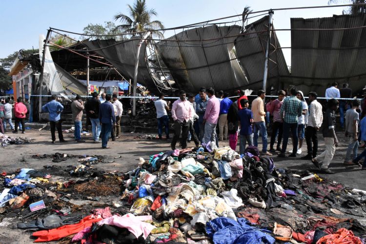 Stall owners look at the debris of their stock which was reduced to ashes in a major fire that broke out in Exhibition at Nampally on Wednesday night. There were some heated and angry moments at Exhibition Society office where stall owners held protest demanding compensation - INN Photos