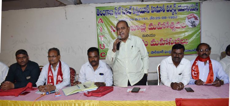 AITUC Telangana State President T. Narasimhan addressing the silver jubilee celebrations of Telangana State Civil Supplies Hamali Workers Union at Shalimar Function Hall, King Koti on Thursday - INN Photos