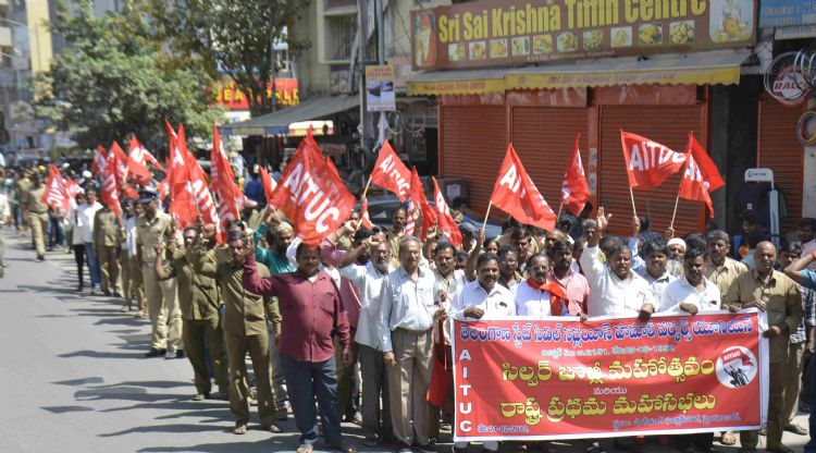 AITUC Telangana State President T. Narasimhan addressing the silver jubilee celebrations of Telangana State Civil Supplies Hamali Workers Union at Shalimar Function Hall, King Koti on Thursday - INN Photos
