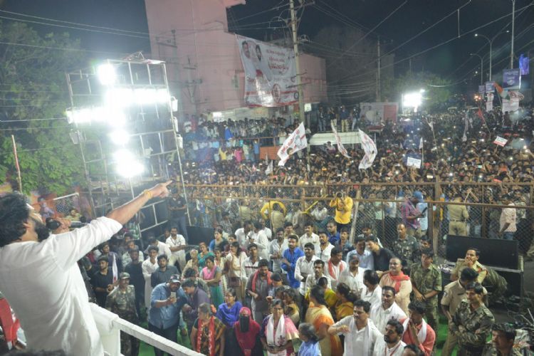 Janasena Chief Pavan Kalyan did a road show in Kadapa district on Wednesday along with Nadendla Manohar and other party leaders. Large number of people came to see him and attended the public meeting in Kadapa.