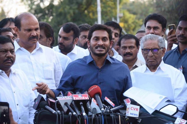 YSR Congress president YS Jagan Mohan Reddy submitting a representation on Data to Governor ESL Narasimhan at Raj Bhavan in Hyderabad on Wednesday. YCP demands Chandrababu Naidu should own up the responsibility of data theft.