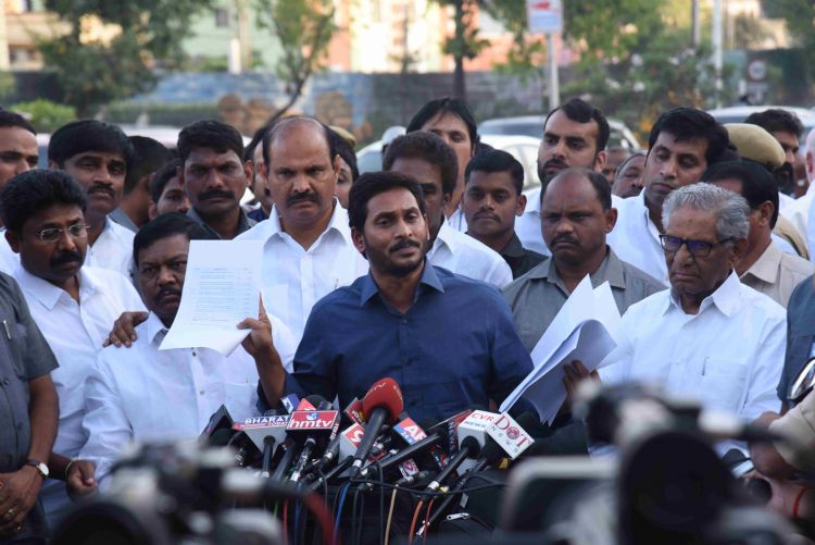 YSR Congress president YS Jagan Mohan Reddy submitting a representation on Data to Governor ESL Narasimhan at Raj Bhavan in Hyderabad on Wednesday. YCP demands Chandrababu Naidu should own up the responsibility of data theft.