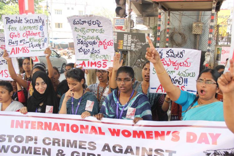 Activists of All India Women's Cultural Association hold protest at Narayanaguda circle on Thursday against the misery and persecution of women in the country. The protest was held to mark the International Women's Day on Friday - INN Photos
