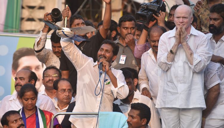 Y.S.Jagan Mohan Reddy addressing a public meeting at Mandapeta in East Godawari district on Wednesday.