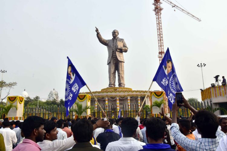 Telangana Chief Minister K Chandrasekhar Rao unveiled the 125-ft tall statue of B R Ambedkar near Hussain Sagar in Hyderabad to commemorate the birth anniversary of the Constitution's architect in a grand celebration - INN Photos