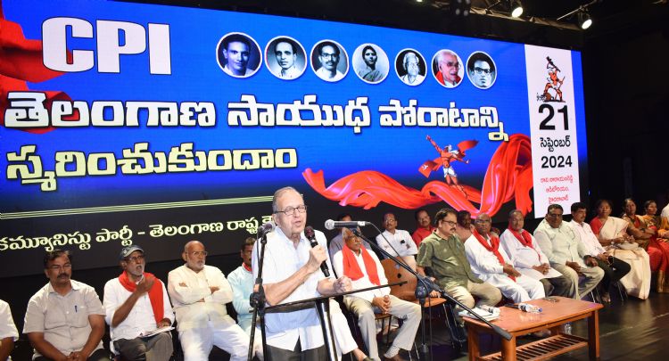 Prof. Haragopal addresses the concluding CPI meeting of the 76th Telangana Armed Struggle Celebrations in Hyderabad, where leaders paid tribute to freedom fighters - INN Photos
