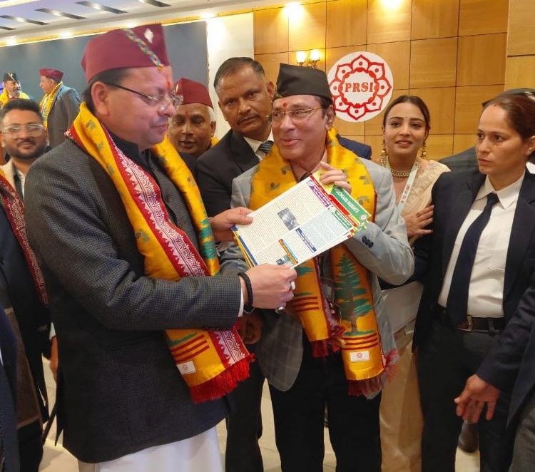 Pushkar Singh Dami, Chief Minister of Uttarakhand, going through the newsletter of Sankar Foundation at the PRSI conference in Dehradun.