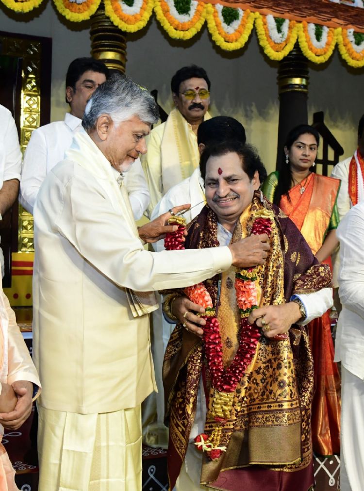 Chief Minister Nara Chandrababu Naidu felicitating Vedic scholar Madugula Nagar Phanindra Sharma during Sri Parabhava nama Ugadi celebrations held at Tummalapalli Kshetrayya Kalakshetram in Vijayawada on Thursday.