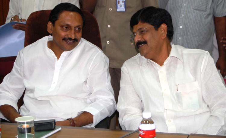 Chief Minister N Kiran Kumar Reddy in a chit chat with Finance Minister Anam Ramnarayana Reddy at Congress Legislature Party meeting in Assembly premises, Hyderabad on Friday. INN Photos