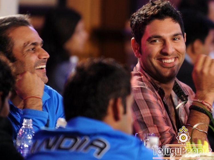 ...while Indian stars VIrender Sewag and Yuvraj Singh share a laugh...