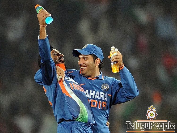 Two Singhs - Harbhajan and Yuvraj - show their delight.