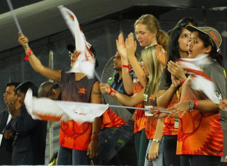 Actor Allu Sirish plays with actress Charmi at Uppal Stadium on Wednesday as Priya Mani looks on. The trio cheered Sunrisers Hyderabad which won its IPL clash with Mumbai Indians.