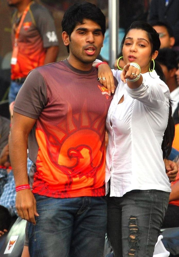 Actor Allu Sirish plays with actress Charmi at Uppal Stadium on Wednesday as Priya Mani looks on. The trio cheered Sunrisers Hyderabad which won its IPL clash with Mumbai Indians.
