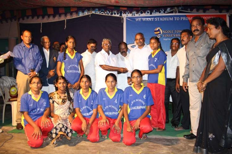 One day Women Invitation Volleyball Tournament was conducted at Kendriya Vidyalaya Grounds, Ongole on Thursday, October 2nd. AP Police Academy Asst Director Sri K Raja Sikhamani inaugurated the program. At the end of the tournament Rajasikhamani felicitated sports men and women who have brought fame to the Prakasam district in National and International games. TeluguPeople.com is a proud partner of this event.