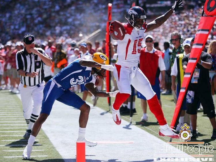 Denver Broncos star Brandon Marshall is forced out of bounds by Al Harris of the Green Bay Packers...