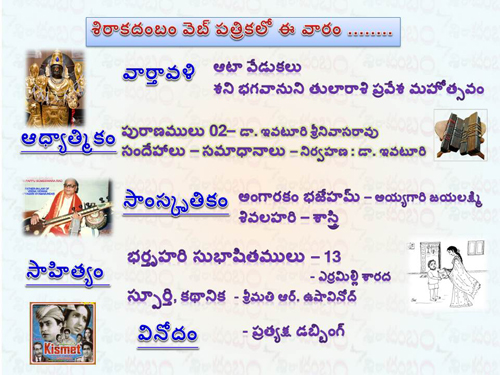 Sirakadambam.... This week..... in శిరా కదంబం - SiRaKadambam at TeluguPeople.com - Telugu Community Portal. Social Networking, Chat, Blogs, Classifieds, Videos, Photos, Galleries, Bollywood, Movies, Hyderabad, Visakhapatnam, Tirupati, Vijayawada, Guntur, Warangal, Kakinada, Kadapa, Kurnool, Rajahmundry and lot more...