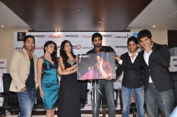 South Scope 2011 Calendar launch event held at Daspalla hotel today. Shriya, Shruthi Hassan, Allu Arjun, Rana Daggubati, Nagachaitanya, Allu Sirish grace this event.