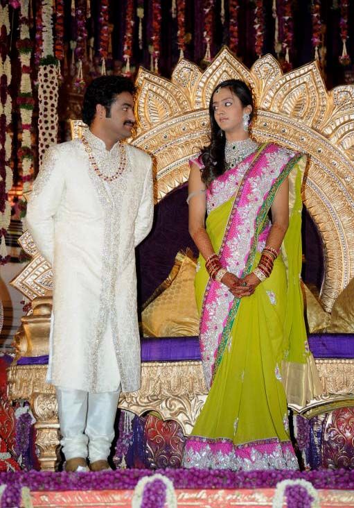 The reception of the much-awaited wedding of Jr NTR -Lakshmi Pranathi held at a grand setting erected at Hitex in Madhapur on Thursday evening. NTR is to tie the knot with Lakshmi Pranathi at 2.41 am (muhurtam) on Friday morning. True to the wishes of NTR the marriage venue resembles the ambience of a royal wedding which is unheard of in Tollywwod.