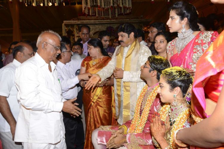 Actor Nandamuri Balakrishna�s younger daughter Tejaswini ties the knot with Sri Bharat at a grand ceremony held in HiTex Convention Center in Hyderabad on Wednesday. Several top political leaders and celebrities of Telugu and Tamil film industry attended the event and blessed the newlywed couple.
