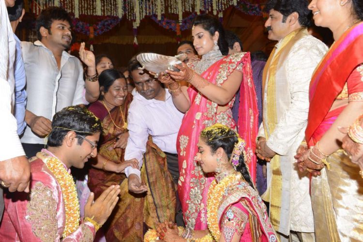 Actor Nandamuri Balakrishna�s younger daughter Tejaswini ties the knot with Sri Bharat at a grand ceremony held in HiTex Convention Center in Hyderabad on Wednesday. Several top political leaders and celebrities of Telugu and Tamil film industry attended the event and blessed the newlywed couple.