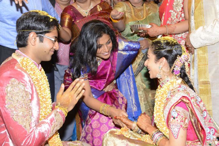 Actor Nandamuri Balakrishna�s younger daughter Tejaswini ties the knot with Sri Bharat at a grand ceremony held in HiTex Convention Center in Hyderabad on Wednesday. Several top political leaders and celebrities of Telugu and Tamil film industry attended the event and blessed the newlywed couple.