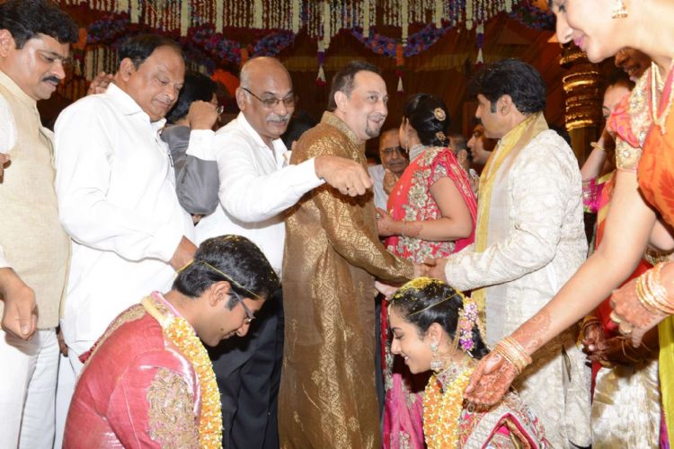 Actor Nandamuri Balakrishna�s younger daughter Tejaswini ties the knot with Sri Bharat at a grand ceremony held in HiTex Convention Center in Hyderabad on Wednesday. Several top political leaders and celebrities of Telugu and Tamil film industry attended the event and blessed the newlywed couple.