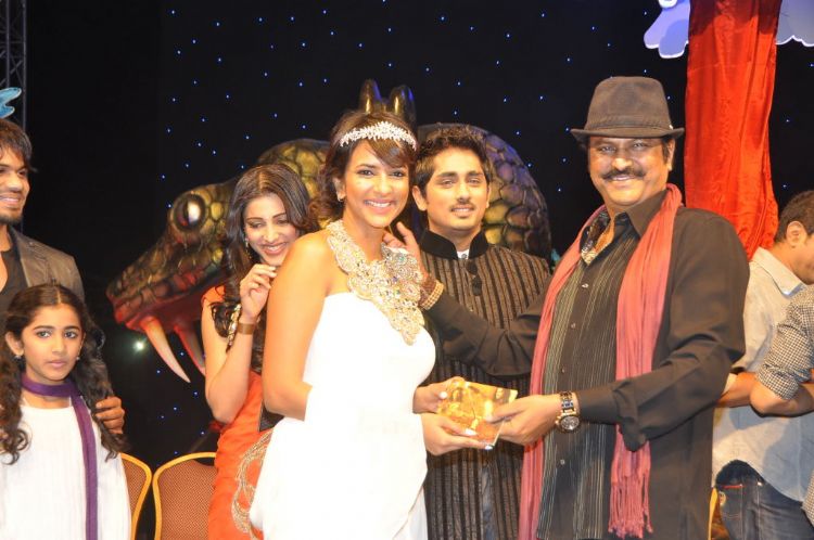 'Anaganaga Oka Dheerudu' audio launch was held on Saturday at Hotel Novotel, Hyderabad. The event has been a grand affair with many of Tollywood bigwigs attended this event and wished for the success of Anaganaga O Dheerudu. Lakshmi Manchu is making her debut into Tolloywood with this film. Siddharth and Shruthi Hasan are playing in lead roles.