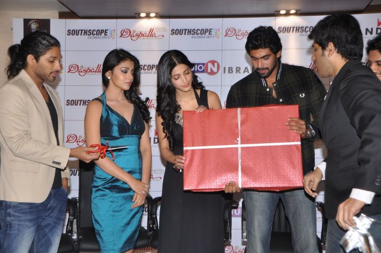 South Scope 2011 Calendar launch event held at Daspalla hotel today. Shriya, Shruthi Hassan, Allu Arjun, Rana Daggubati, Nagachaitanya, Allu Sirish grace this event.