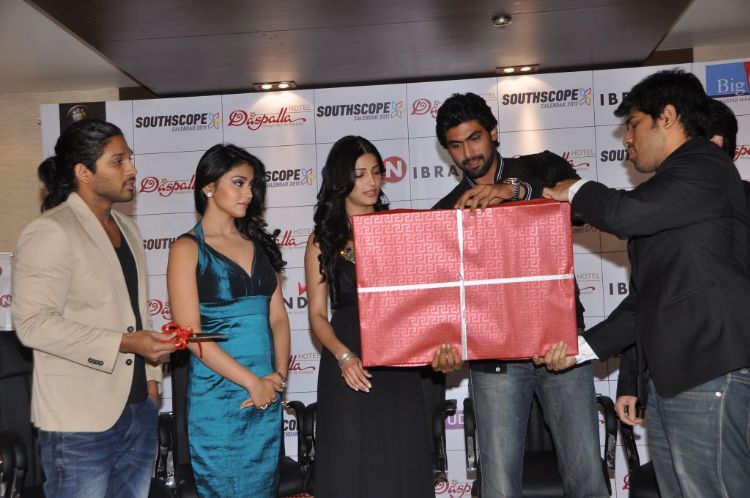 South Scope 2011 Calendar launch event held at Daspalla hotel today. Shriya, Shruthi Hassan, Allu Arjun, Rana Daggubati, Nagachaitanya, Allu Sirish grace this event.