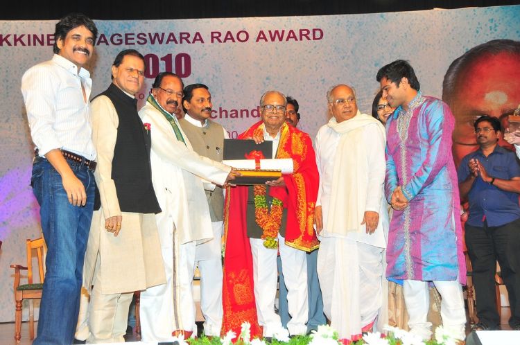 Veteran filmmaker Dr. K Balachander was honoured with prestigious ANR National Award yesterday at Silpa Kala Vedika . CM Kiran Kumar Reddy, ANR, Veerappa Moily and other dignitaries presented him a Memento and a cash prize of Rs. 5 lakhs. Akkineni family members like Nagarjuna, Amala, Naga Susheela, Naga Chaitanya, Akhil, Sumanth and others were present. Indian Idol Sreeram Chandra was the prime attraction of the day and he entertained the audience with some old Telugu songs.