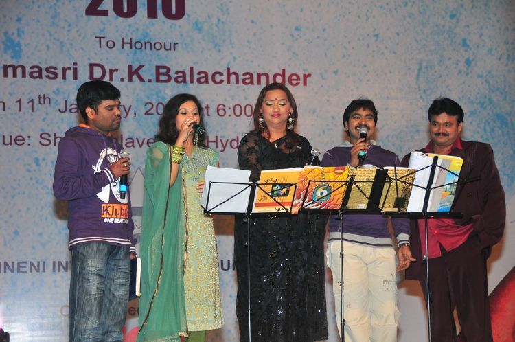 Veteran filmmaker Dr. K Balachander was honoured with prestigious ANR National Award yesterday at Silpa Kala Vedika . CM Kiran Kumar Reddy, ANR, Veerappa Moily and other dignitaries presented him a Memento and a cash prize of Rs. 5 lakhs. Akkineni family members like Nagarjuna, Amala, Naga Susheela, Naga Chaitanya, Akhil, Sumanth and others were present. Indian Idol Sreeram Chandra was the prime attraction of the day and he entertained the audience with some old Telugu songs.