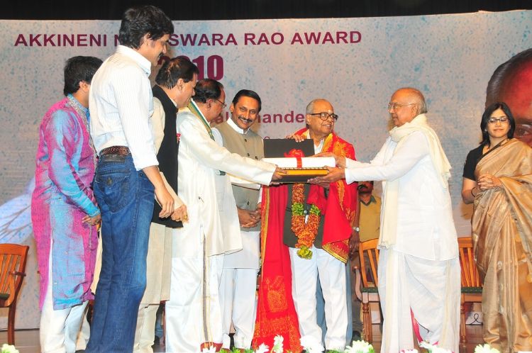 Veteran filmmaker Dr. K Balachander was honoured with prestigious ANR National Award yesterday at Silpa Kala Vedika . CM Kiran Kumar Reddy, ANR, Veerappa Moily and other dignitaries presented him a Memento and a cash prize of Rs. 5 lakhs. Akkineni family members like Nagarjuna, Amala, Naga Susheela, Naga Chaitanya, Akhil, Sumanth and others were present. Indian Idol Sreeram Chandra was the prime attraction of the day and he entertained the audience with some old Telugu songs.