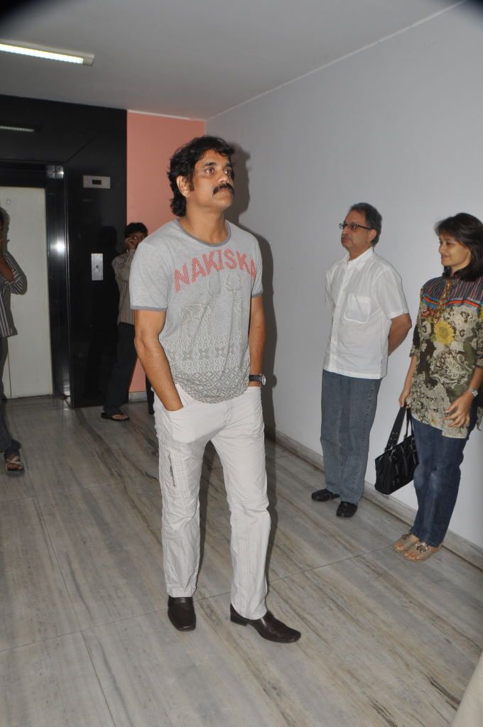 Akkineni Nagarjuna along with his family members attended Gaganam premiere show held at Prasad Labs on Wednesday.