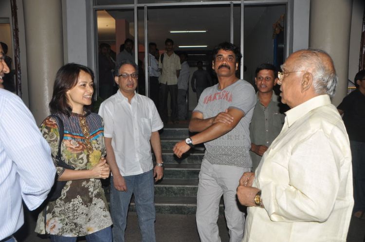 Akkineni Nagarjuna along with his family members attended Gaganam premiere show held at Prasad Labs on Wednesday.