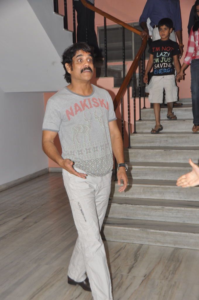 Akkineni Nagarjuna along with his family members attended Gaganam premiere show held at Prasad Labs on Wednesday.