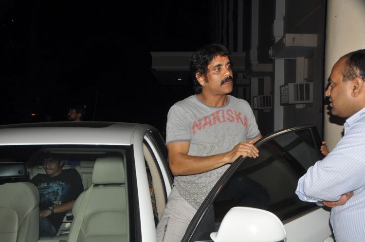 Akkineni Nagarjuna along with his family members attended Gaganam premiere show held at Prasad Labs on Wednesday.