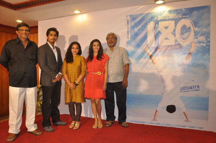 Hero Siddharth’s upcoming bilingual film 180’s first look was revealed today at a press meet held in Taj Banjara. In this film Nithya Menon and Priya Anand are playing the female lead roles. Director Jayendra has shot several ad films for years and making his forays into commercial film making.