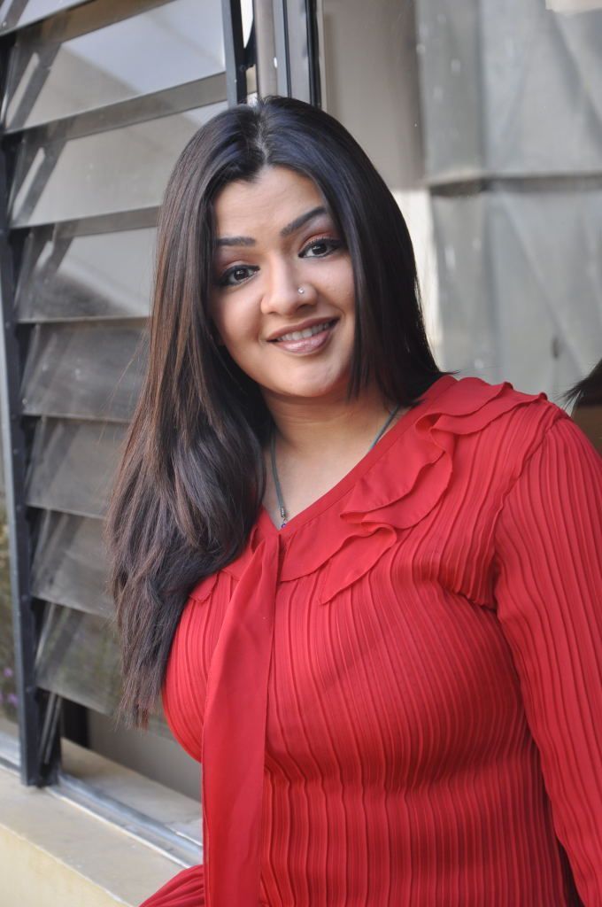 Aarti Agarwal happily posing for pictures at a press meet.