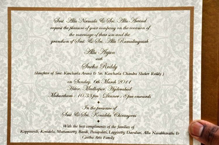 Actor Allu Arjun's wdding invitation is out. Allu family, it is learnt, to have taken special care in designing the wedding invitation. The invitation card has been designed and printed in Delhi and each invitation card costs around Rs.1200/.