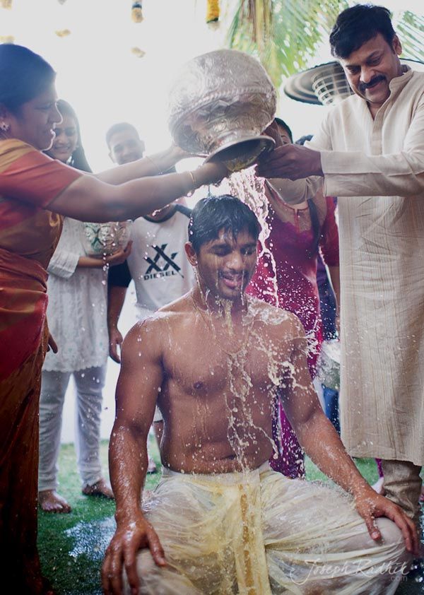 Allu Arjun a.k.a Bunny became 'Varudu' in real life. He had a ceremonial bath (Mangala Snanam) from the hands of his maternal uncle and aunt Chiranjeevi and Surekha at the laters residence in full bride groom attire on Wednesday. The wedding is to be held on March 6 at Hitex, Hyderabad.